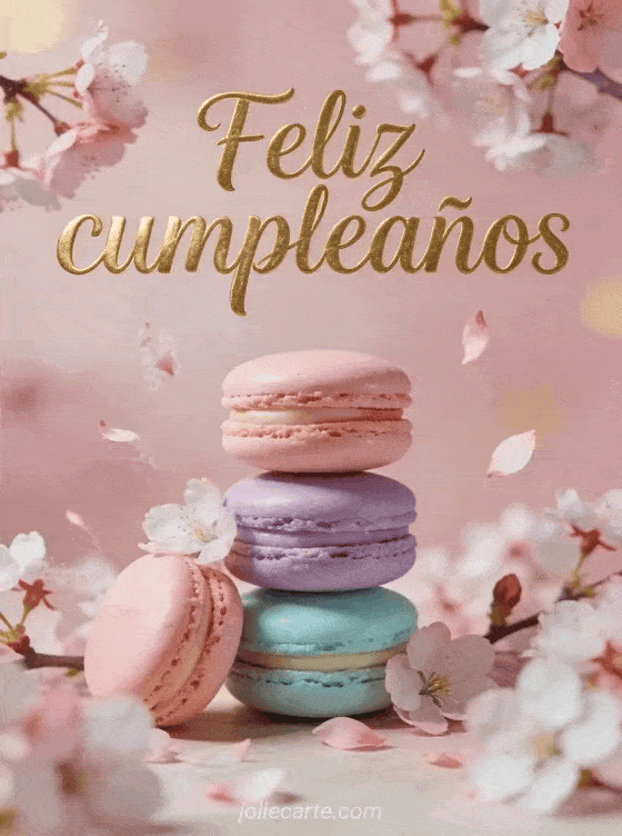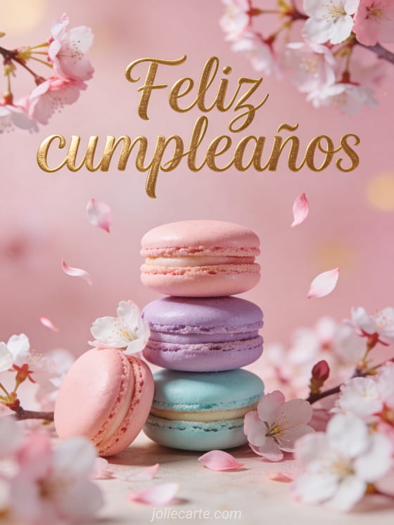 Envía este dulce saludo de cumpleaños con delicados macarons pastel y flores de cerezo para hacer el día de alguien especial. Descubre también una imagen de cumpleaños para chica adolescente o una tarjeta de cumpleaños para chica adolescente o una tarjeta gratis de cumpleaños para chico adolescente.
