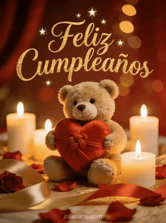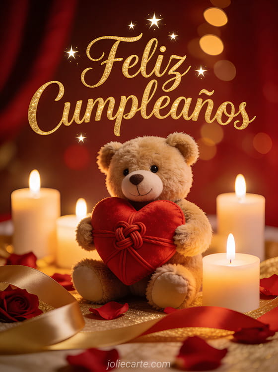 Celebra el cumpleaños de tu ser querido con esta tarjeta romántica con un oso de peluche, velas y pétalos de rosa. Descubre también una tarjeta de cumpleaños romántica o una tarjeta feliz cumpleaños mi amor.