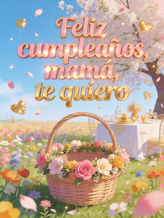 Dile a mamá que la quieres con letras rosas y doradas, un campo luminoso de flores silvestres, una corona de flores sobre una cesta de mimbre, una mesa bajo un árbol en flor, pétalos al viento y corazones dorados. También pueden enviar feliz cumpleaños mamá imágenes, un feliz cumpleaños mamá gif o una feliz cumpleaños mamá joven tarjeta.