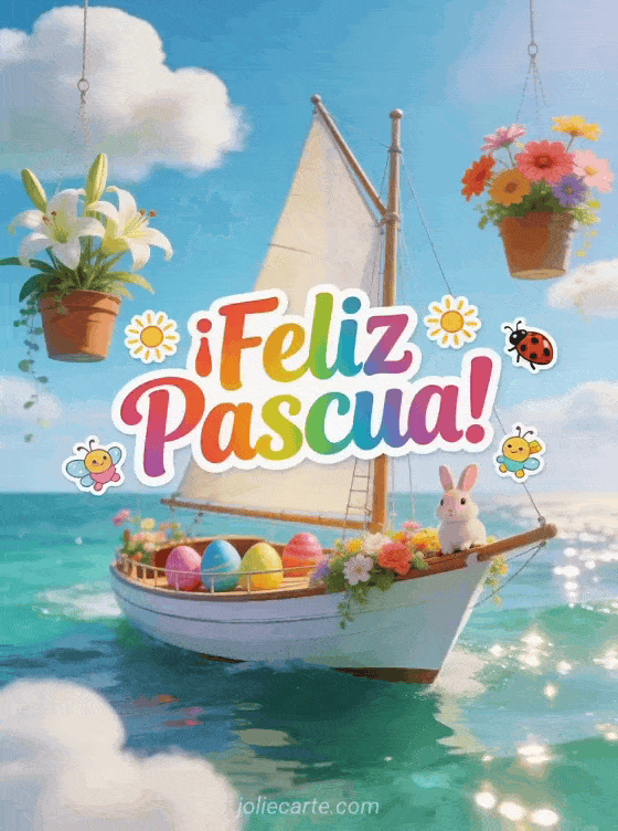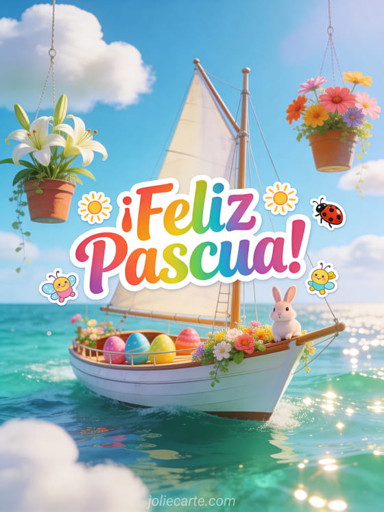 Envia esta alegre tarjeta de felicitaciones de Pascua con un velero blanco en un mar esmeralda brillante, huevos de Pascua coloridos y un lindo conejito en la proa. Lirios y cosmos en macetas colgantes completan esta escena festiva. Descubre tambien una tarjeta de felices fiestas de Pascua, una tarjeta virtual de Pascua o una imagen de Pascua gratis.