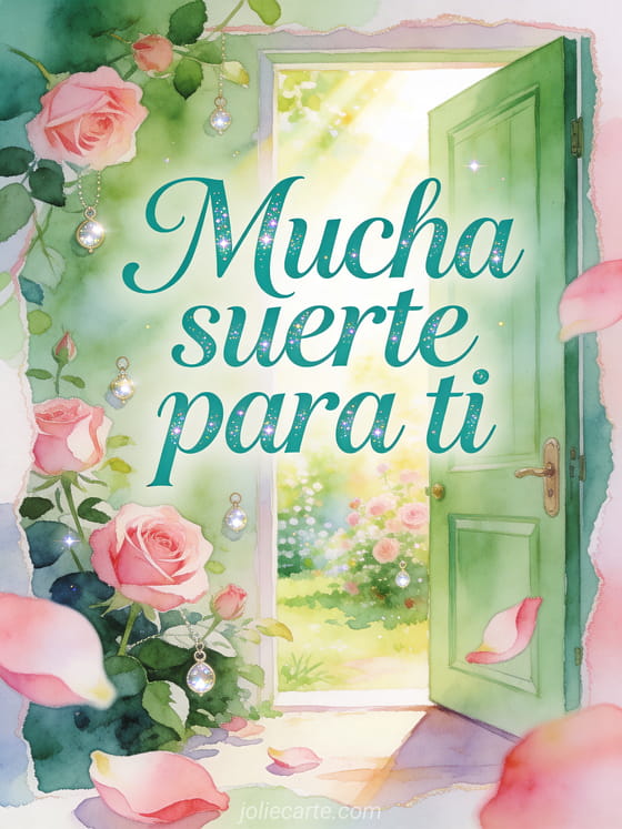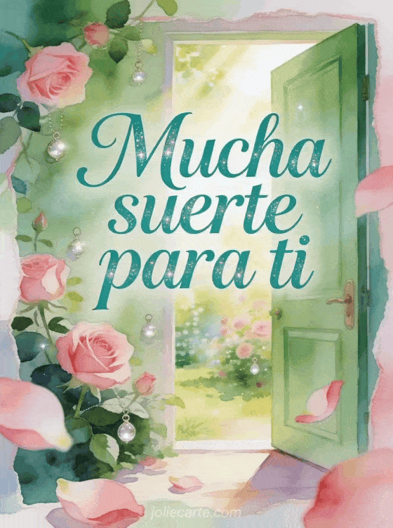 Envía mucha suerte para ti con elegantes letras jade, una puerta verde de la suerte abierta hacia un jardín radiante, rosas y pequeños amuletos brillantes. Descubre también mucha suerte en tu examen texto, buena suerte gifs animados gratis o un mensaje para desear buena suerte en un examen.