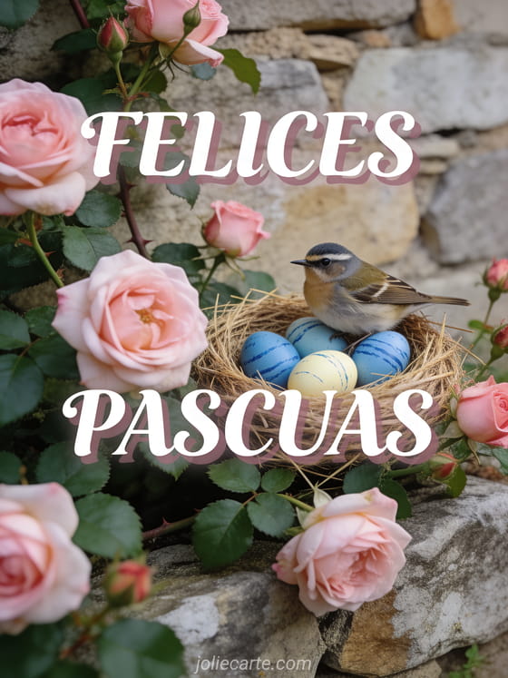 Un acogedor nido con un pequeño gorrión y huevos marmolados azules y crema en un rosal trepador rosa en flor — una tierna y poética tarjeta de Pascua. Descubre también una tarjeta de gallina de Pascua, un texto feliz Pascua o una feliz fiesta de Pascua.