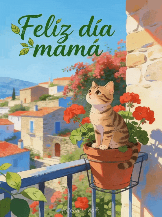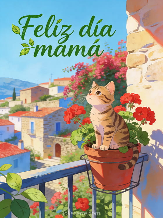 Celebra a mamá con esta alegre tarjeta de felicitación gratuita. Una encantadora ilustración muestra un gato atigrado sentado en una maceta de geranios rojos en un balcón soleado con vista a un pueblo mediterráneo, con buganvillas en el fondo. Descubre también una tarjeta con fotos para el Día de las Madres, una tarjeta con flores para el Día de las Madres o una tarjeta para el Día de las Madres.