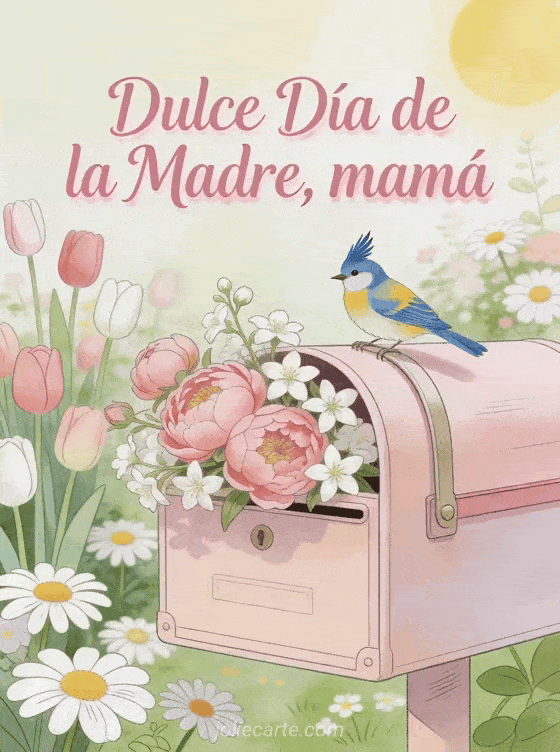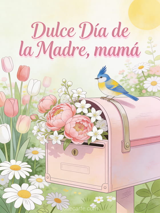 Deleita a mamá con esta elegante tarjeta con un jilguero sobre un buzón vintage rosa pastel rebosante de peonías y jazmín. Descubre también una tarjeta día de la madre gratis o un texto tarjeta día de la madre.