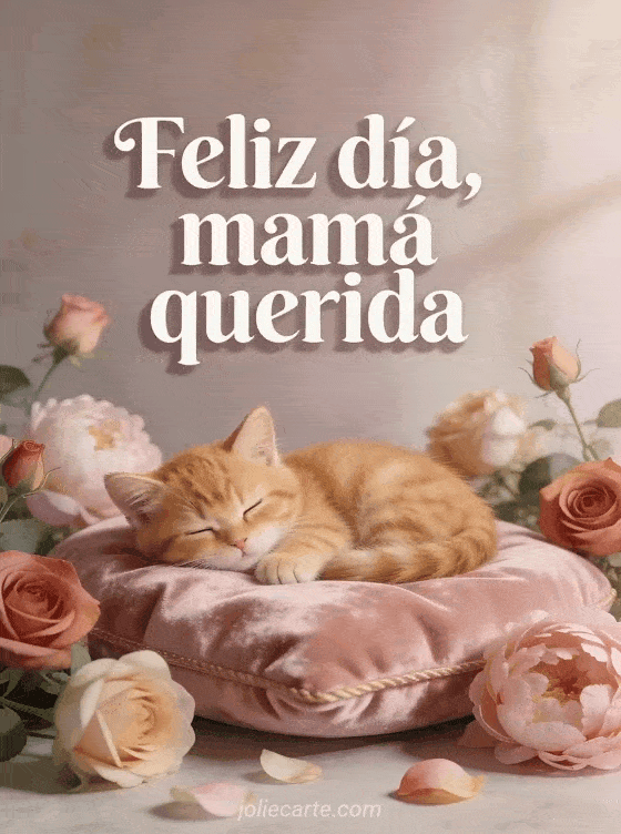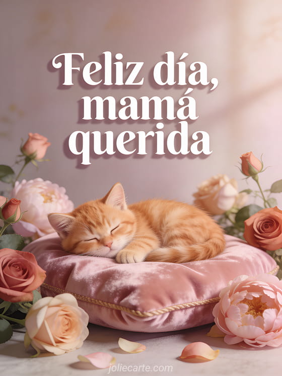 Sorprende a mamá con esta dulce tarjeta con un adorable gatito naranja dormido entre rosas y peonías. Descubre también tarjeta gratis día de la madre o tarjeta feliz día de la madre.