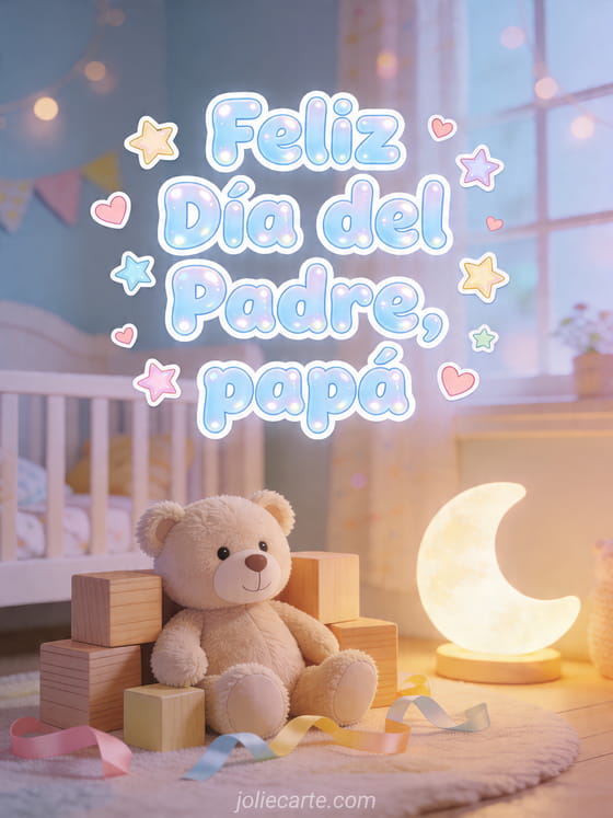 Envía una tarjeta Día del Padre bebé con letras burbuja azul cielo, stickers de estrellas pastel y corazones pequeños, un oso de peluche entre bloques de madera, cintas pequeñas y una lámpara con forma de luna en un ambiente acogedor de cuarto infantil. Descubre también una tarjeta corazón del Día del Padre, feliz día del padre a mi hijo o feliz día del padre a todos los papás.