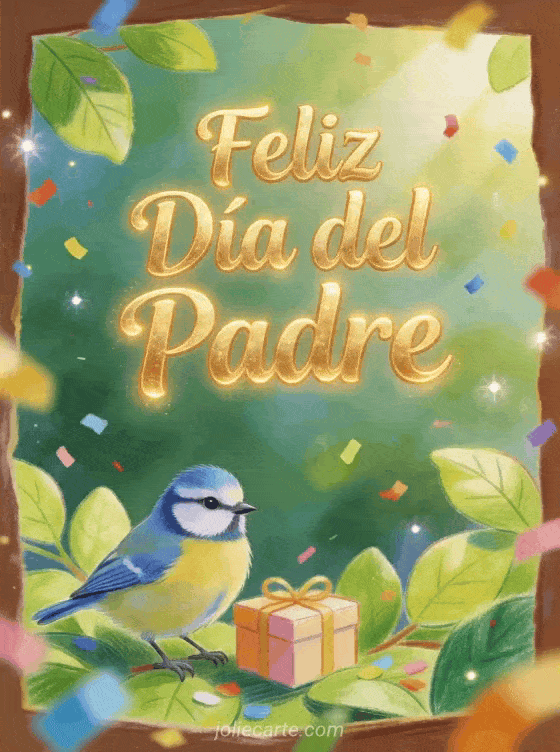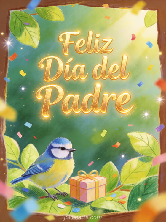 Envíen una tarjeta alegre de Día del Padre con una ilustración en lápiz de color de un herrerillo posado junto a un pequeño regalo envuelto entre hojas verdes luminosas y confeti colorido. Vean también buen domingo día del padre, felicitaciones día del padre o una tarjeta Día del Padre corbata.