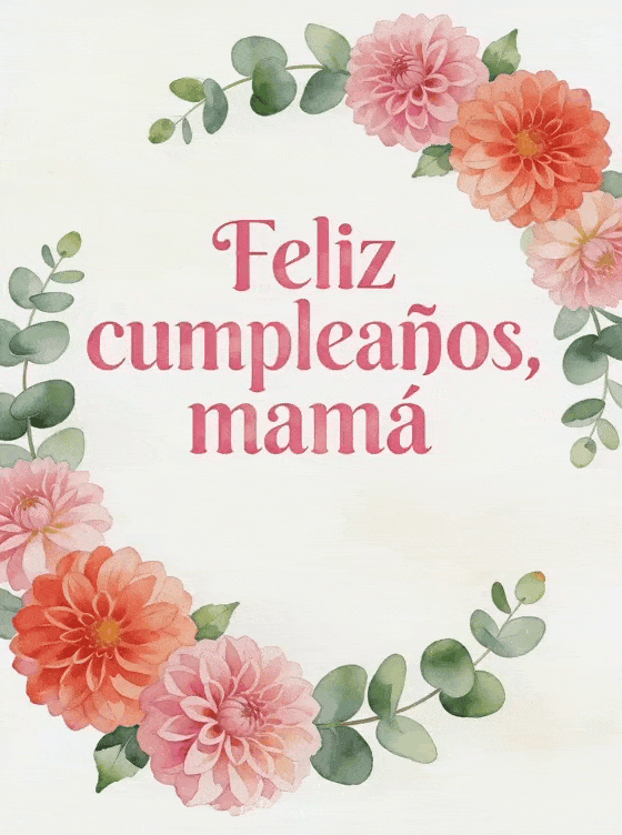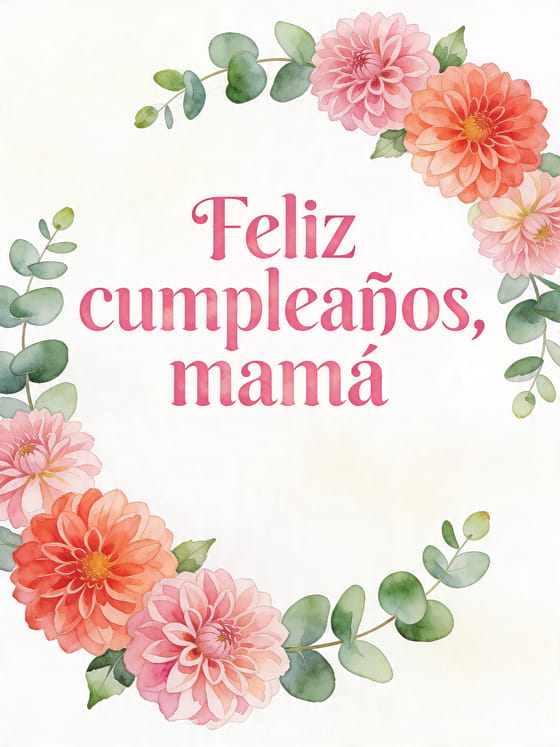 Comparte un cariñoso deseo de cumpleaños para tu mamá con esta elegante tarjeta floral de dalias rosas y coral con eucalipto sobre un suave fondo crema. Descubre también mensaje cumpleaños mamá, tarjeta cumpleaños mamá y feliz cumpleaños mamá.