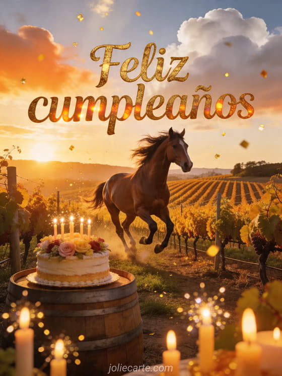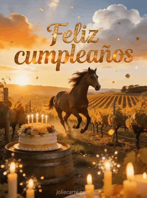 Comparte un cálido deseo de cumpleaños con esta festiva tarjeta de un caballo café galopando en un viñedo dorado, velas brillantes y un pastel con flores sobre un barril. Descubre también cumpleaños hija gif, tarjeta feliz cumpleaños niñita y felicitaciones de cumpleanos para mi hija.