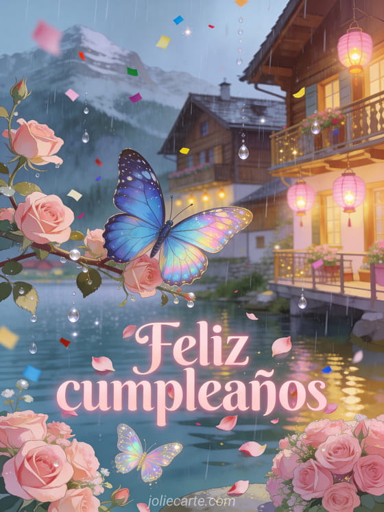 Celebra un cumpleaños con esta tierna tarjeta que muestra una mariposa morpho azul posada en una rama florecida junto a un lago alpino suizo con chalets de madera bajo una lluvia suave, rosas rosadas, confeti de colores y faroles rosados. Descubre también una tarjeta de cumpleaños de cuento de hadas o una tarjeta de cumpleaños en la arena.