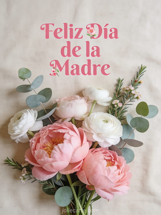 Comparte tus mejores deseos del Día de la Madre con este elegante flat lay fotorrealista de peonías rosas, ranúnculos blancos y eucalipto. Descubre también tarjetas feliz día de la madre o una tarjeta para el día de la madre.