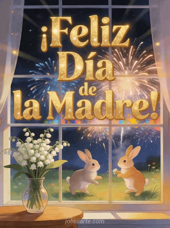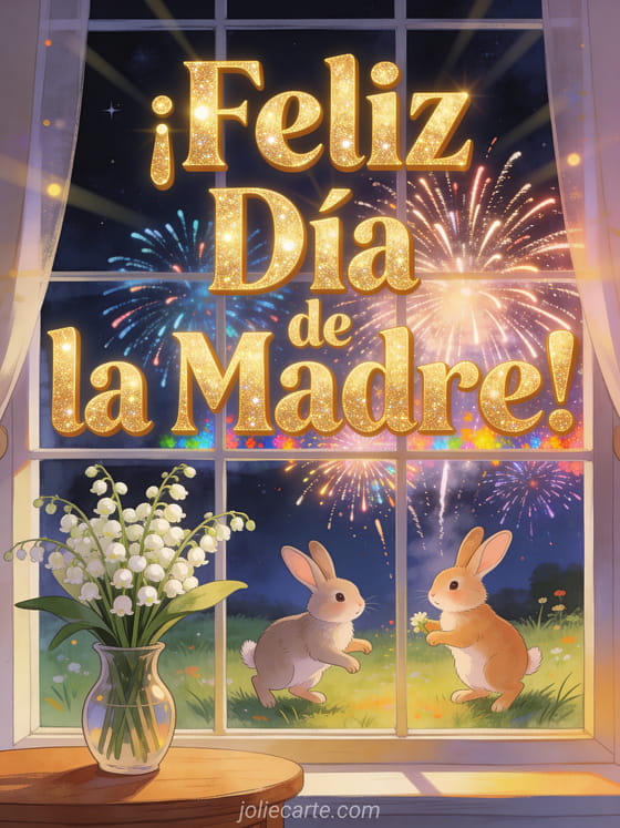 Celebra a mamá con esta festiva tarjeta de feliz día de la madre con letras doradas y dos conejos junto a una ventana con espectaculares fuegos artificiales. Descubra también una imagen día de la madre gratis o feliz día de la madre mamá.