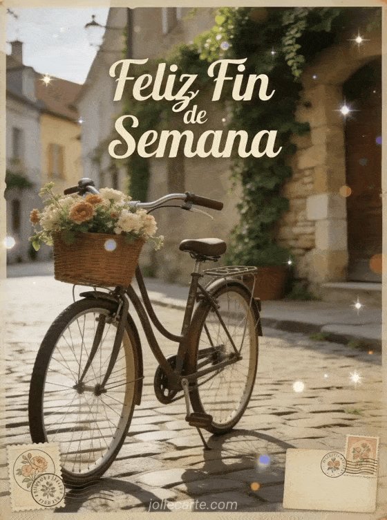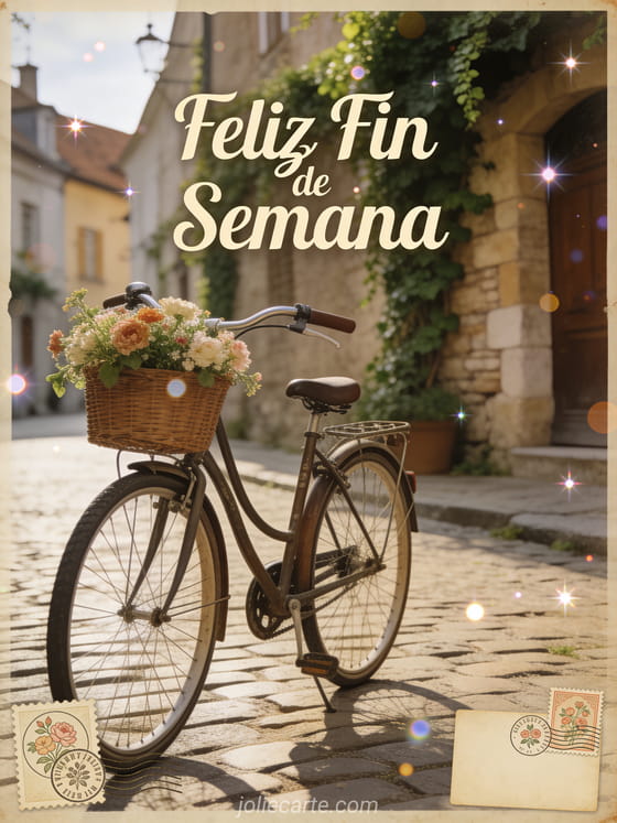 Desea un feliz fin de semana con esta encantadora postal vintage que presenta una bicicleta antigua con cesta de flores en una calle empedrada de un pueblo europeo con paredes cubiertas de hiedra. Descubre también un feliz fin de semana soleado o un buen fin de semana lluvioso humor.