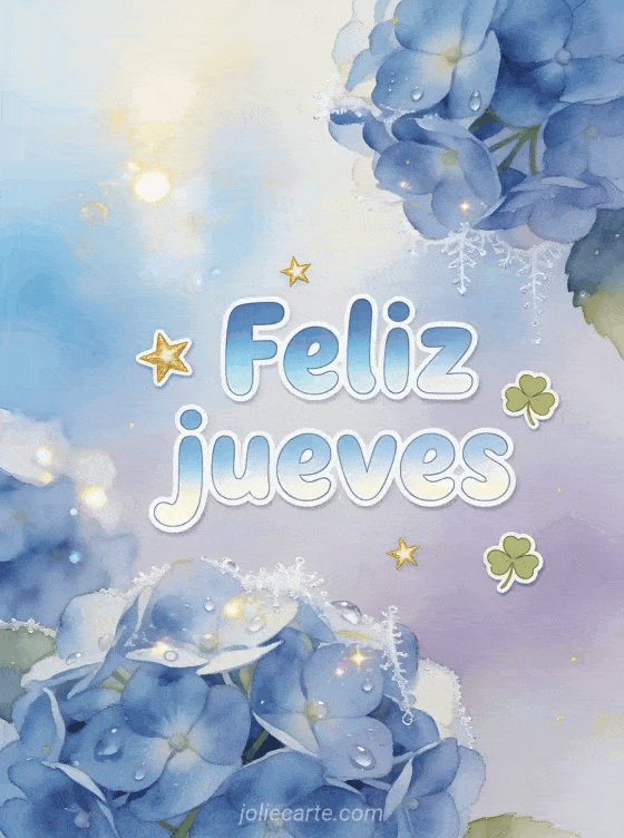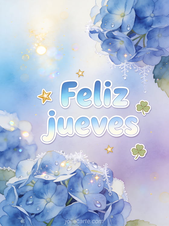 Envía un feliz jueves delicado con hortensias azules, rocío brillante, escarcha fina y un fondo pastel lavanda. Descubran también una desear un feliz jueves en imagen, buen día jueves o feliz jueves gato.