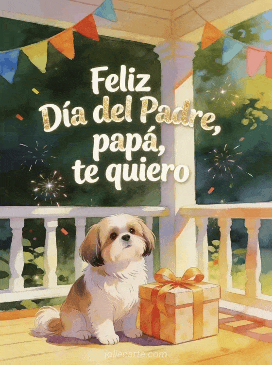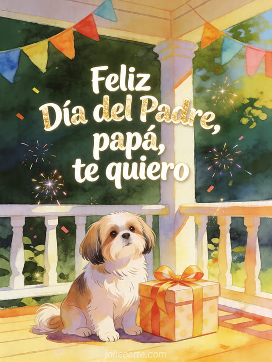 Envíen una tarjeta gratis del Día del Padre con letras marfil redondeadas, brillo dorado suave y una ilustración gouache de un shih tzu junto a una caja de regalo con cinta en un porche soleado con guirnalda colorida. También pueden descubrir feliz Día del Padre papá imagen, feliz Día del Padre mi hijo o amor Día del Padre texto amor.