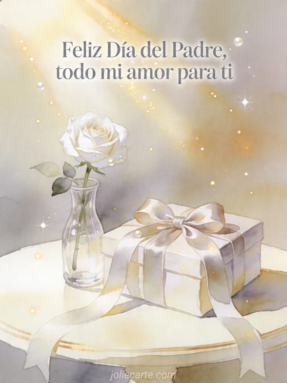 Comparte una tarjeta luminosa en acuarela para el Día del Padre con una rosa blanca en un jarrón de vidrio, un regalo con cinta y rayos dorados de sol. Este diseño sereno y tierno es ideal para enviar todo tu amor. Descubre también tarjeta del papá, feliz día a papá o una tarjeta para día del padre.