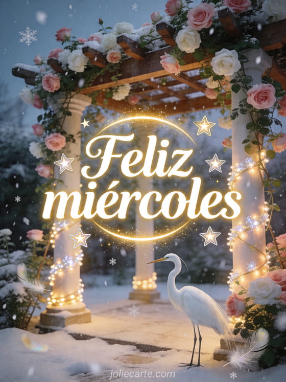 Comparte un mágico Feliz miércoles con una pérgola florida, una majestuosa garceta blanca y luces invernales centelleantes. Descubre también imágenes gif feliz miércoles, nota feliz miércoles y foto buenas noches de miércoles.