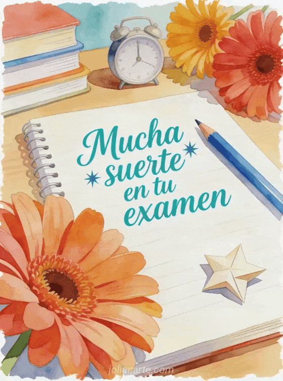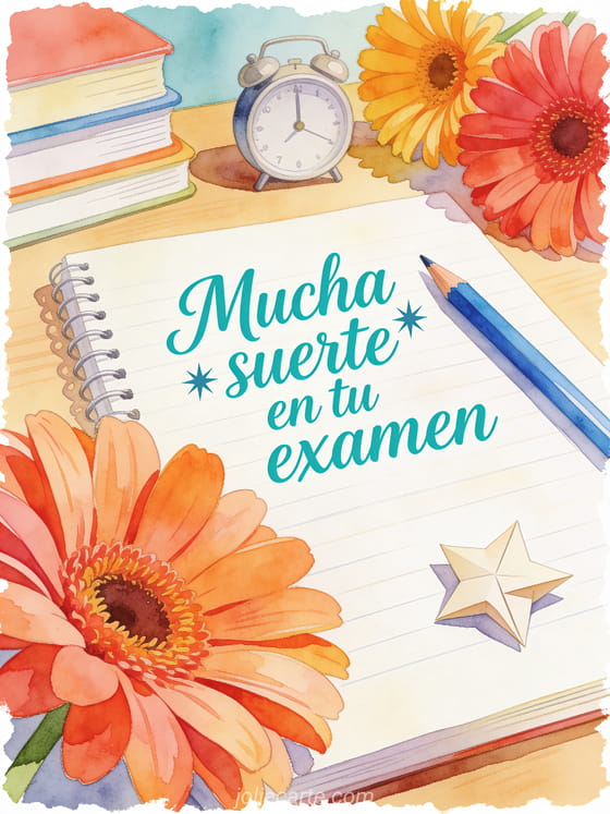 Envía un mensaje enfocado de suerte para un examen con caligrafía turquesa clara, pequeños destellos, un lápiz azul, un reloj pequeño, una estrella de papel de la suerte y gerberas brillantes. También pueden compartir un texto mucha suerte nuevo trabajo, un mensaje de buena suerte o un adiós y buena suerte texto.