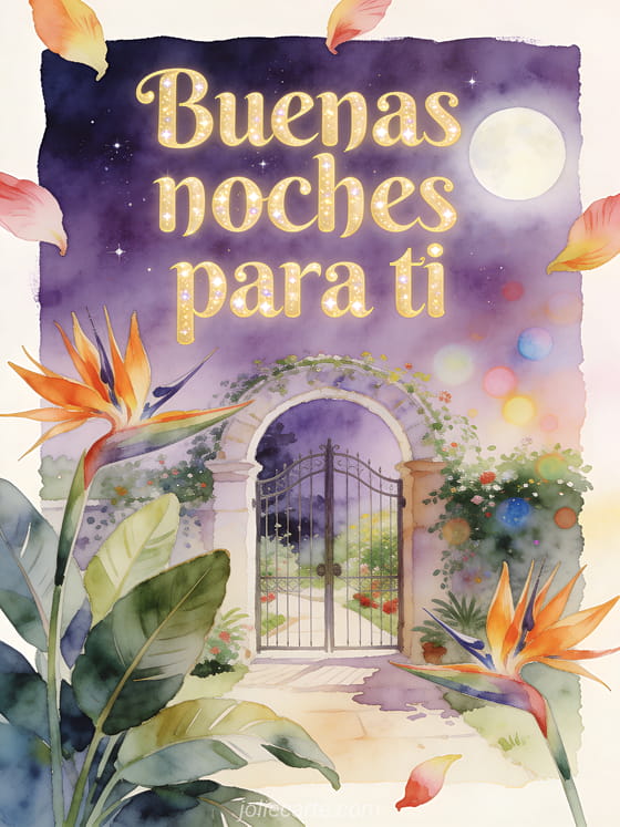 Envía un deseo tranquilo de buenas noches con un portal arqueado de jardín, cielo violeta, brillo de luna y flores de ave del paraíso. Descubre también una tarjeta virtual feliz noche buenas noches, un bonito mensaje de buenas noches o un mensaje de buenas noches para él.
