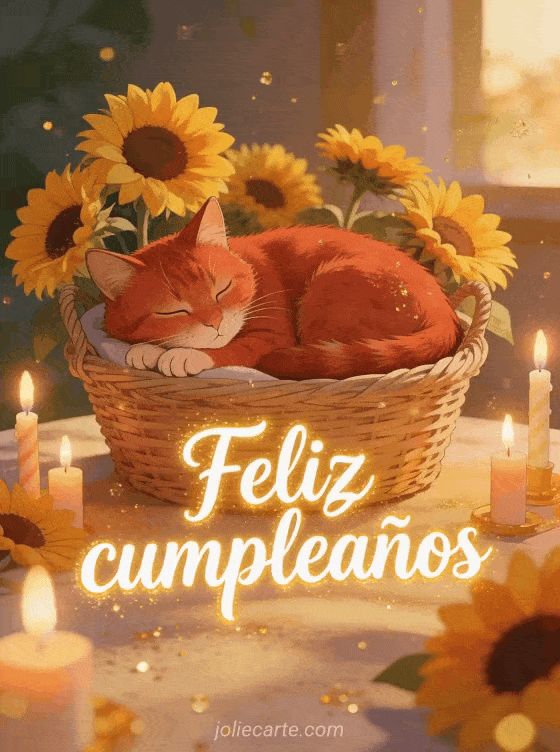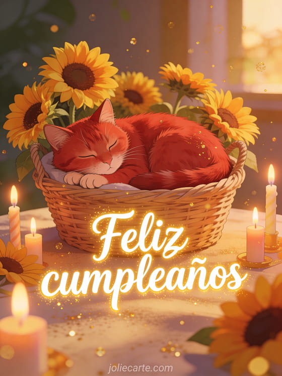 Envía un tierno feliz cumpleaños con esta acogedora tarjeta con un gato naranja durmiendo entre girasoles y velas de cumpleaños. Descubre también una tarjeta cumpleaños fuegos artificiales o una tarjeta cumpleaños paisaje de montañas o una tarjeta cumpleaños disfruta cada momento.
