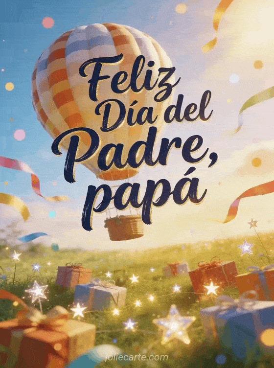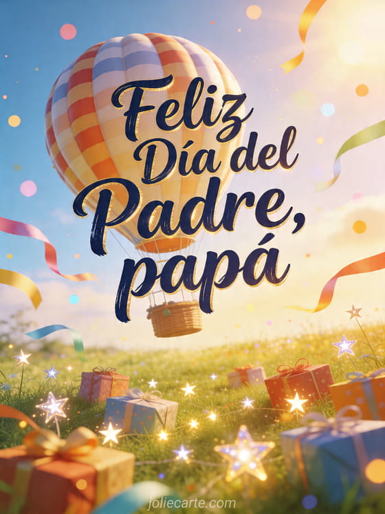 Envíen una tarjeta original del Día del Padre con letras de pincel azul marino, brillo dorado, un globo aerostático a rayas sobre una pradera luminosa, regalos, luces de estrellas y cintas coloridas. También pueden descubrir feliz día del padre papá, tarjetas Día del Padre o una tarjeta gratis feliz día del padre.