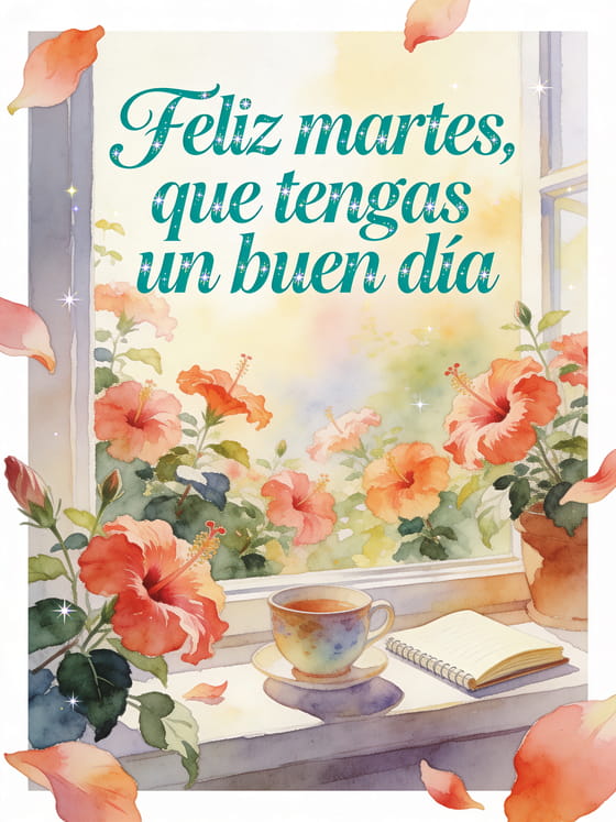 Envía un saludo cálido de feliz martes y buen día con un alféizar acogedor lleno de flores de hibisco, una taza de té de cerámica y un pequeño cuaderno abierto. Descubre también una imagen para desear un feliz martes, una buenos días martes imagen o una feliz martes frío imagen.