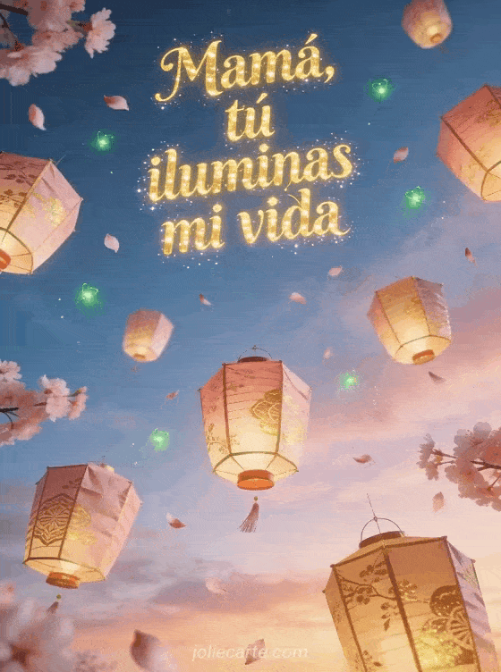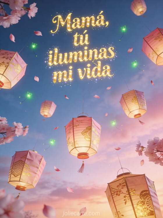 Celebra a mamá con esta encantadora tarjeta para el día de la madre con letras doradas brillantes, linternas flotantes y pétalos de cerezo. Descubre también modelo de tarjeta para día de la madre o buenos días feliz día de la madre.