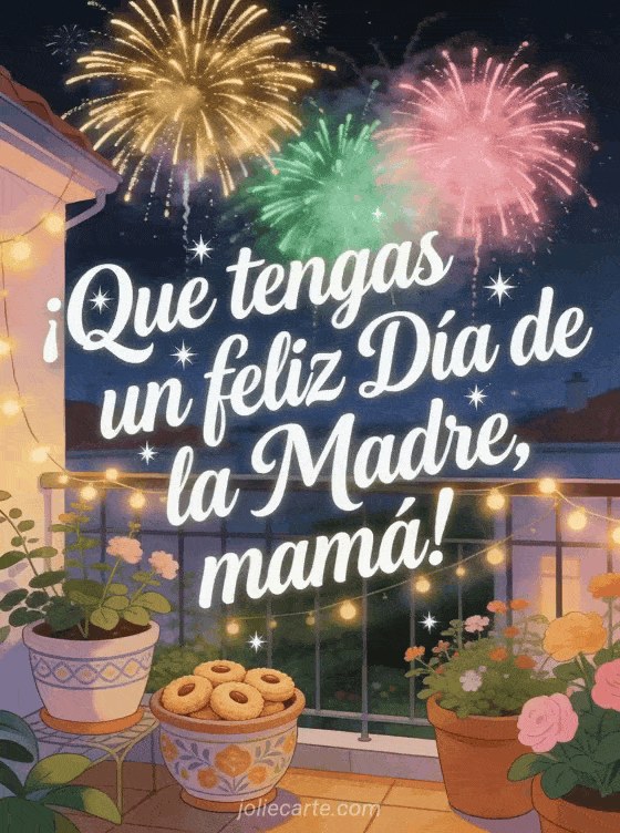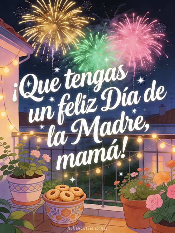 Celebra con esta vibrante tarjeta para el día de la madre. Un jardín en la azotea de noche con espectaculares fuegos artificiales que pintan el cielo en dorado, verde y rosa, bellos claveles en macetas decorativas y luces de hadas. Descubre también una tarjeta gratis feliz día de la madre o una tarjeta de la madre gratis.