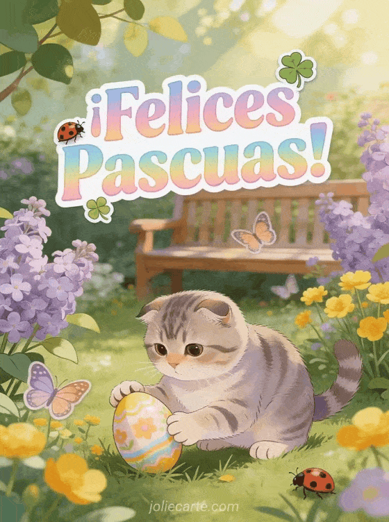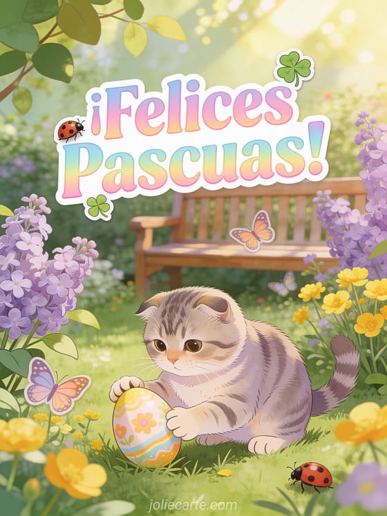 Un gato Scottish Fold jugando con un huevo de Pascua decorado entre lilas y ranúnculos en un jardín de primavera — una alegre tarjeta de Pascua gratis. Descubre también una tarjeta de Pascua, una tarjeta de gallina de Pascua o una linda tarjeta Felices Pascuas.