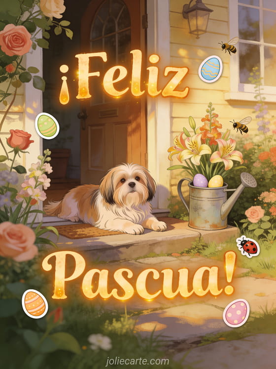Celebre la Pascua con esta hermosa tarjeta que presenta un adorable perro lhassa apso en un jardin campestre lleno de flores y huevos de colores. Descubra tambien una tarjeta de video de Pascua o un mensaje de Feliz Pascua.