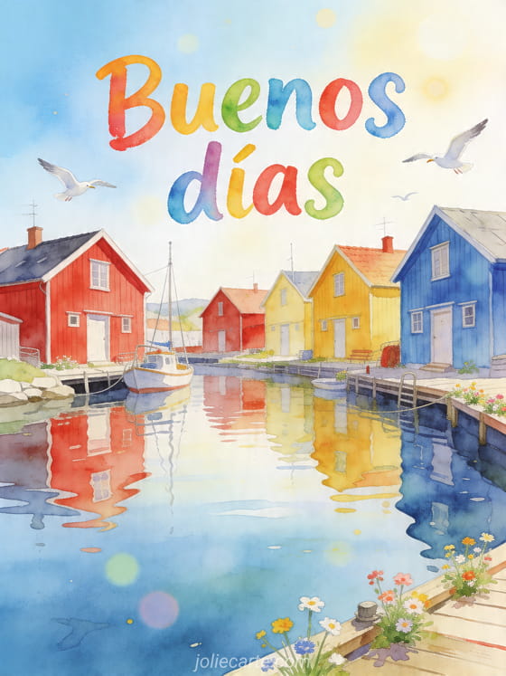 Comparte un brillante saludo de buenos días con casas coloridas frente al agua, flores de primavera y cielo azul despejado. Descubre también buenos días noviembre imágenes, poema de buenos días conmovedor y amistad buenos días mensaje de la mañana.