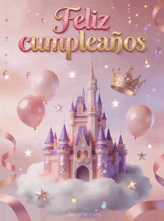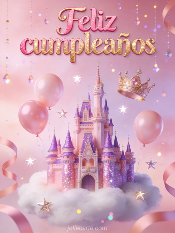 Envía esta encantadora tarjeta virtual de cumpleaños para niña princesa con un castillo brillante sobre una nube, una corona dorada y purpurina cayendo. Descubre también una tarjeta de feliz cumpleaños pequeño unicornio o una imagen feliz cumpleaños bebé.