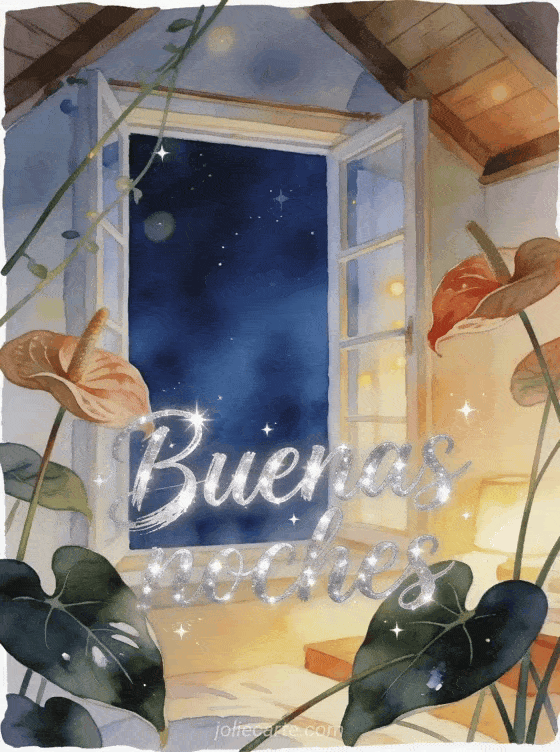 Comparte buenas noches con letras plateadas luminosas, una ventana de ático acogedora abierta hacia un cielo nocturno azul profundo, flores de anturio y hojas brillantes con luz interior cálida. Descubre también buenas noches besos tarjeta, un mensaje de buenas noches para su esposa o un bonito mensaje para desear buenas noches.