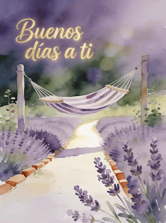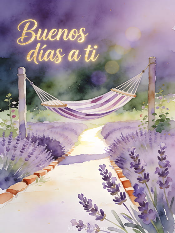 Envía una tarjeta virtual de buenos días para ti con letras violetas relajadas en acuarela, una hamaca rayada y ramitas de lavanda junto a un camino luminoso de jardín. Descubran también mensaje de buenos días de mañana para persona especial, mensaje de buenos días para tu crush o mensaje de buenos días para mi hermosa.