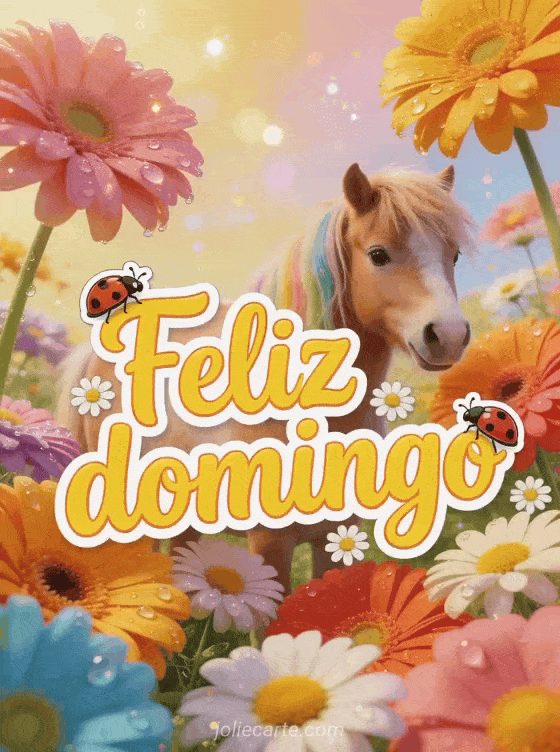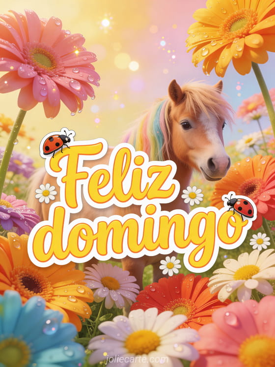 Envía un feliz domingo colorido con gerberas brillantes, mariquitas, margaritas y un adorable poney shetland bajo una luz dorada cálida. Descubran también una bonita tarjeta feliz domingo soleado, feliz domingo lluvioso o feliz domingo gifs animados.