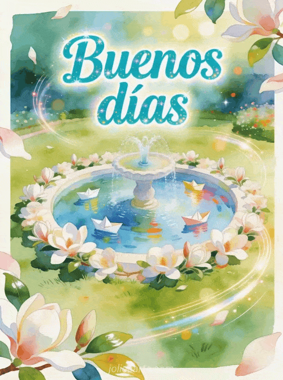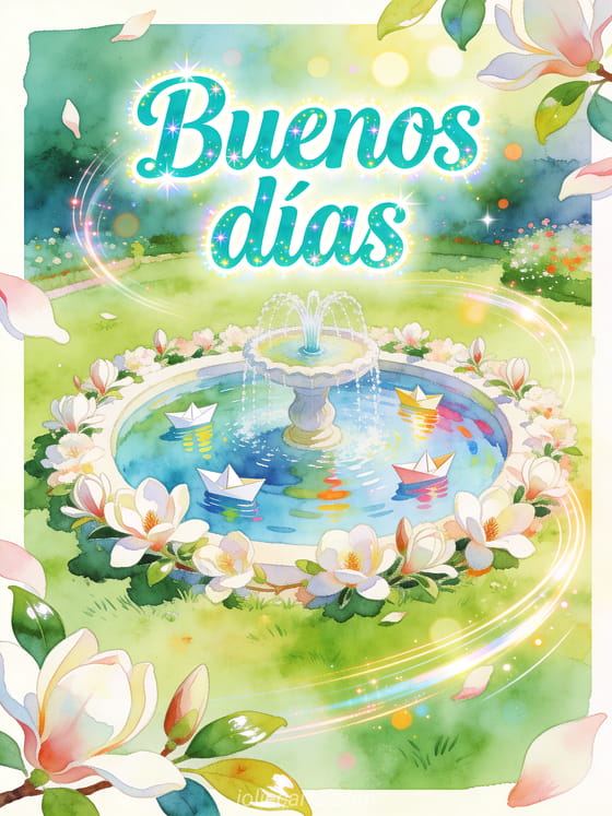 Envía tarjetas animadas de buenos días con letras turquesa vivaces en acuarela, una fuente de jardín juguetona, magnolias y barcos de papel flotando. Descubran también tarjeta virtual de buenos días para ti, mensaje de buenos días de mañana para persona especial o mensaje de buenos días para tu crush.