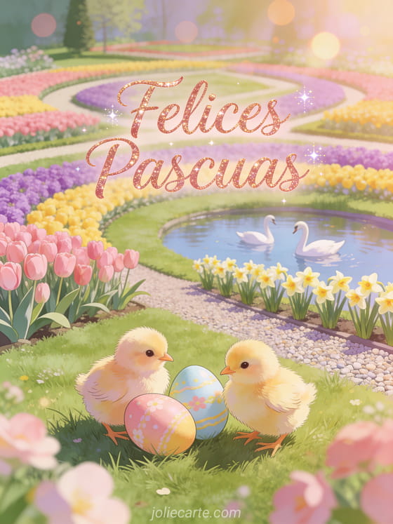 Celebra la Pascua con esta encantadora tarjeta animada gratuita con dos adorables pollitos junto a huevos de Pascua pintados en un césped de Keukenhof con parterres geométricos de tulipanes en rosa, amarillo y morado, cisnes en un estanque y narcisos. Descubre también texte carte de voeux pâques jolie carte animée de paques.