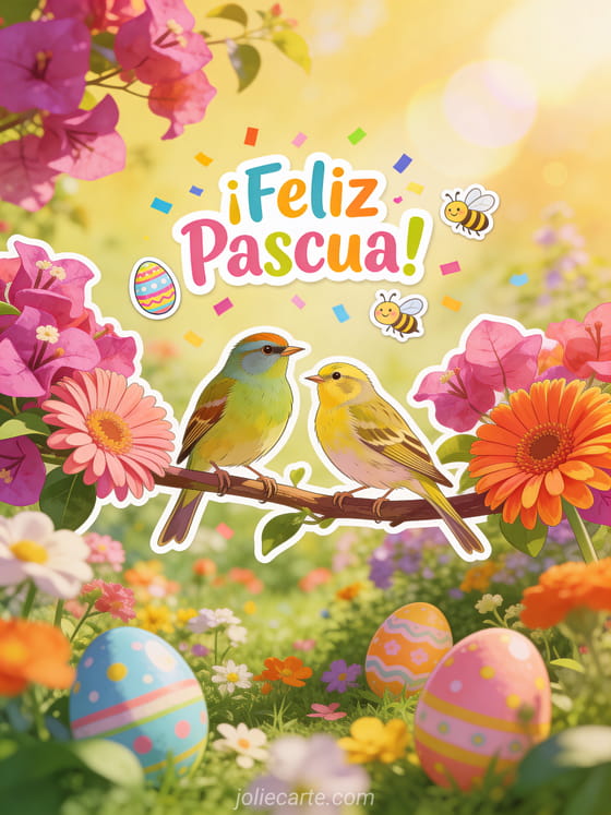 Comparte estas tarjetas de Pascua gratis para Facebook con un verdecillo y un serin posados en una rama de buganvilla y gerberas, con huevos de Pascua coloridos entre flores primaverales. Una ilustracion brillante y festiva. Descubre tambien una tarjeta de Pascua, una tarjeta gratis de feliz Pascua o una tarjeta virtual de Pascua.