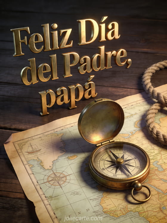 Envíen tarjetas del Día del Padre con letras doradas metálicas, una brújula antigua de latón abierta sobre una carta náutica vintage y una cuerda marinera en una mesa de madera oscura. También pueden descubrir una tarjeta gratuita Día del Padre, día del padre para mi hijo o una cita corta Día del Padre.