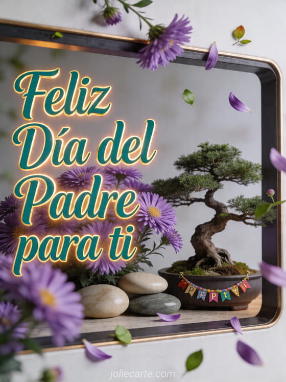 Envía tarjetas Día del Padre con texto esmeralda seguro, un bonsái realista junto a asters morados, piedras cerámicas lisas y una pequeña guirnalda festiva en un ambiente sereno y alegre. Descubre también una tarjeta gratis feliz día del padre, una tarjeta del papá o feliz día a papá.