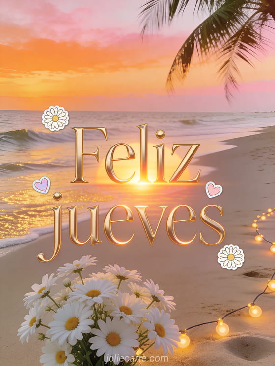 Compartan una tarjeta cálida de feliz jueves con letras doradas elegantes de atardecer, stickers de margaritas, corazones pastel, una playa de arena bajo un cielo naranja y rosa, margaritas blancas en primer plano, hojas de palmera danzando, olas doradas y guirnaldas luminosas. Vean también buenos días feliz jueves, imagen animada de feliz jueves o estas feliz jueves soleado imágenes.