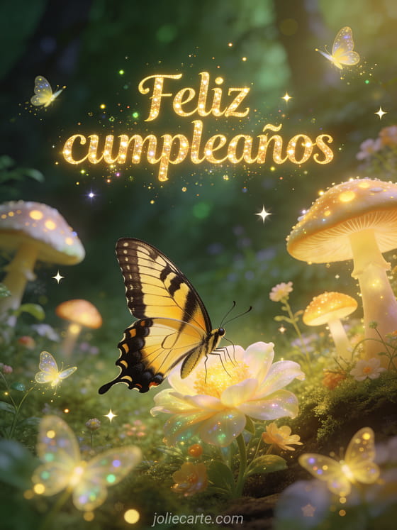 Celebra un cumpleaños con esta encantadora tarjeta que muestra una magnífica mariposa macaón posada sobre una flor féerica en un claro mágico con hongos luminosos, luciérnagas y estrellas centelleantes. Descubre también una tarjeta de cumpleaños en la arena o una tarjeta de cumpleaños sorpresa.