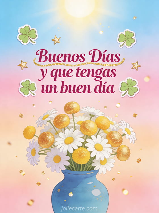 Comienza el día con esta luminosa tarjeta con un ramo de botones de oro y margaritas en un jarrón azul, tréboles de cuatro hojas, cielo azul radiante y paillettes doradas. Descubre también una tarjeta de buen día con besos o una tarjeta de buen día con humor.