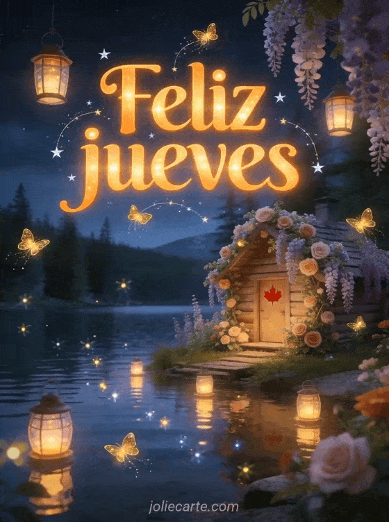 Comparte un mágico Feliz jueves con una cabaña florida, linternas brillantes y reflejos resplandecientes sobre el lago. Descubre también imagen feliz jueves, feliz jueves invernal y feliz jueves animado.