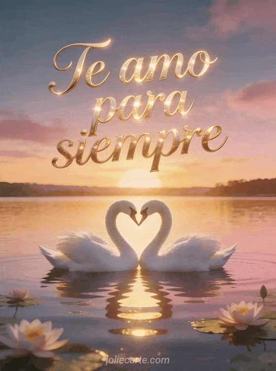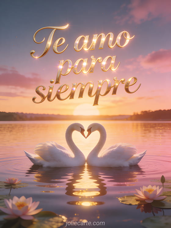 Envía esta hermosa tarjeta con las palabras Te amo para siempre escritas en elegantes letras doradas, con dos cisnes blancos formando un corazón en un lago tranquilo al atardecer rodeado de nenúfares. Descubre también una tarjeta mi corazón te dice te quiero o una pareja enamorada te quiero gif.