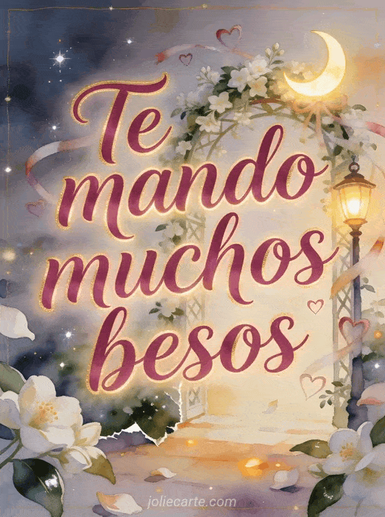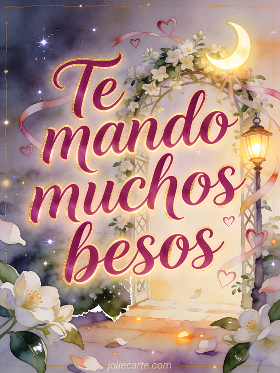 Manda muchos besos en una pérgola de jazmín en acuarela, con una lámpara de luna creciente encendida, cintas de corazón y luz cálida brillante. También pueden compartir mandar besos gif, lluvia de besos imágenes o mono besos gif.