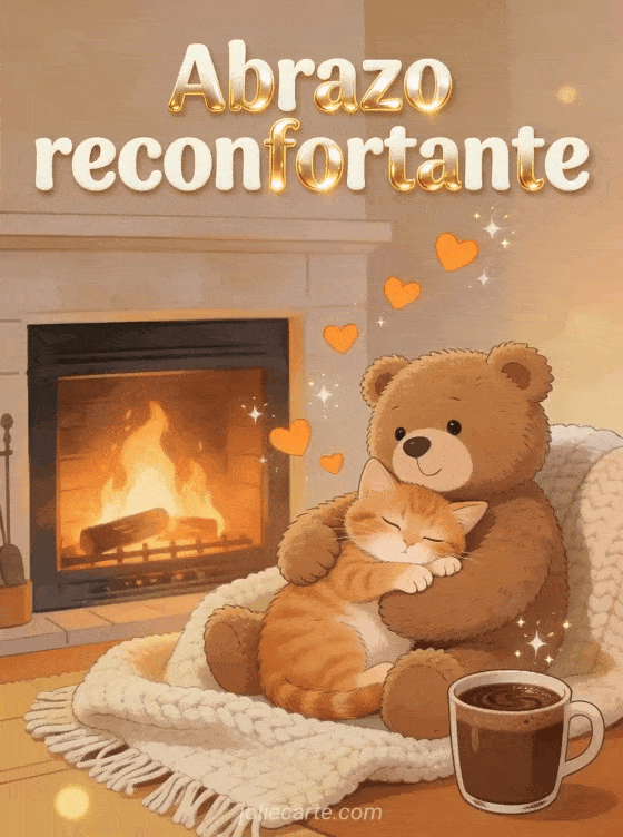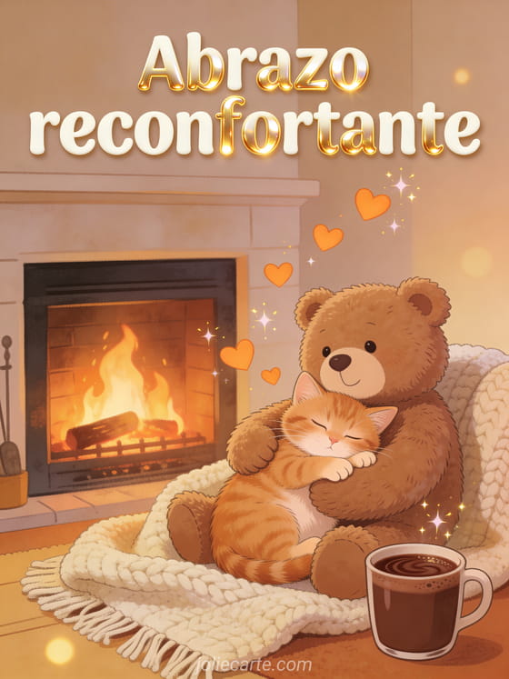 Envía esta acogedora tarjeta de abrazo reconfortante con un gatito naranja durmiendo en los brazos de un oso de peluche marrón frente a una chimenea con llamas suaves y corazoncitos naranjas flotando con chispas. Una manta de lana y una taza de chocolate caliente completan esta reconfortante escena. Descubre también una tarjeta de gran abrazo de amor o una tarjeta de abrazo de amor con cisnes.