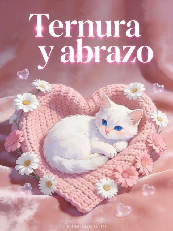 Envíen un mensaje cálido y tierno con esta tarjeta gratis de abrazo con un gatito blanco, una manta tejida en forma de corazón y flores románticas. Descubran también un abrazo para ti mi amor, ternura abrazos afecto o abrazo romántico foto de pareja enamorada.