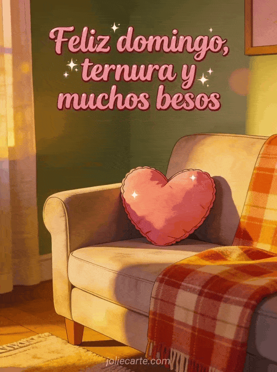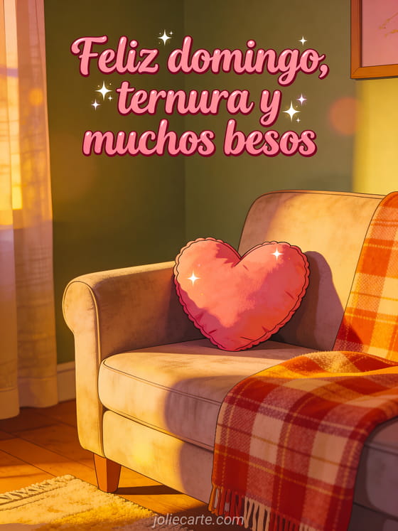 Envía un saludo cálido de feliz domingo con letras rosadas dibujadas a mano, acentos brillantes, un rincón de sofá acogedor, un cojín de corazón, texturas de manta cálida y un ambiente afectuoso. También pueden ver estas flores domingo, este feliz domingo mensaje o esta buenos días feliz domingo.