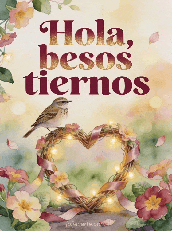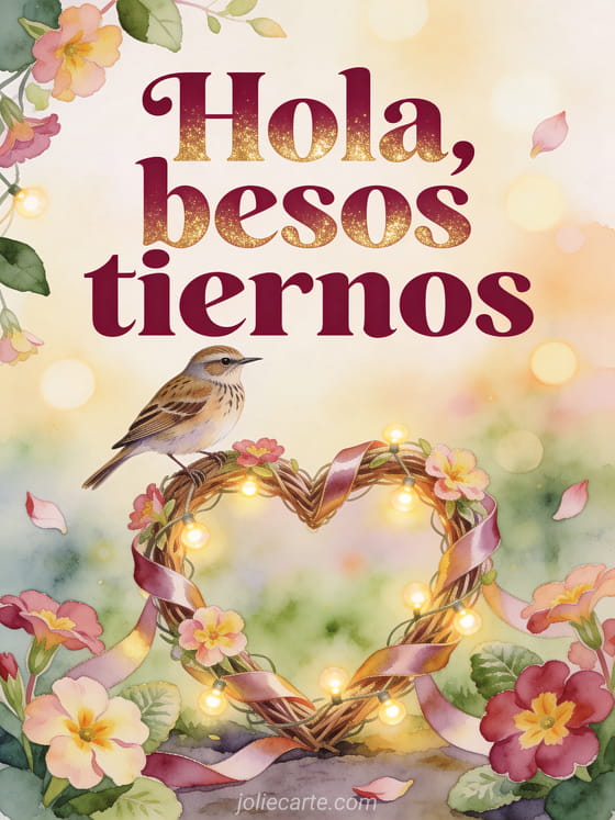 Comparte un saludo cálido con letras arándano en acuarela, un pipit posado junto a una corona en forma de corazón tejida con prímulas, cintas de satén y luces de jardín brillantes. Descubre también un hola ustedes, una tarjeta de tarjeta bonita hola muchos besos o un saludo de hola vida.